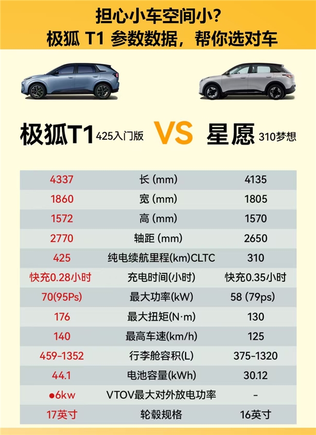 续航与配置方面,极狐T1同样亮点十足。续航上,极狐T1425km 的续航里程,比吉利星愿 310 梦想版多 115km,能减少日常充电次数,提升出行便利性。配置上,极狐T1更显 “越级”,与吉利星愿 410 探索版相比,极狐T1配备 18 寸轮毂,星愿最高配仅 16 寸,18 寸轮毂不仅美观,还能提升行驶稳定性;星愿前排无钥匙进入仅主驾驶有,极狐T1则有带电动遮阳帘的全景天幕等越级配置,540° 全景影像功能也更全面。极狐T1的 8.8 寸液晶仪表和 15.6 寸中控屏,比星愿的数字仪表和 14.6 寸中控屏更具优势,相同价格下极狐T1多出十多项实用配置,切实提升用车舒适度。